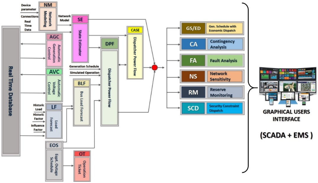 Applications Energy management software in the new system will include Network Modelling, State Estimator, Load Forecast, Equipment Outage Scheduler, Bus Load Forecast, Operations Ticket, Dispatcher Power Flow, Generation Scheduling with ED, Contingency Analysis, Fault Analysis, Network Sensitivity, Reserve Monitoring, Automatic Generation Control (AGC) and Automatic Voltage Control (AVC).